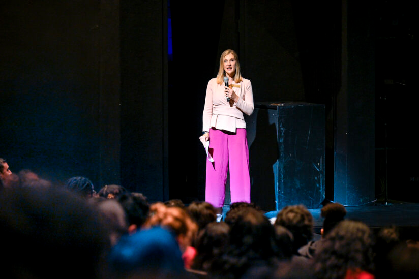 Dean Emily Roxworthy of the USC School of Dramatic Arts addresses the high school students in the audience. (USC Photo/Gus Ruelas)