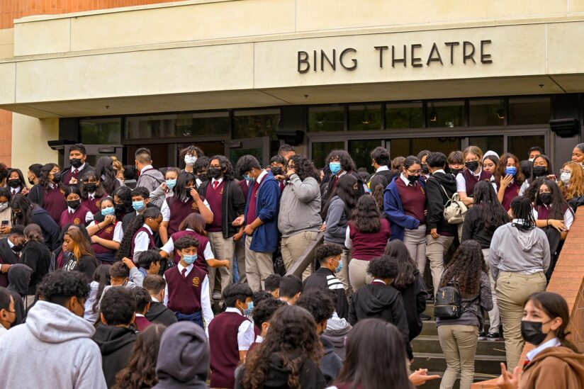 Students from local area schools gather outside USC’s Bing Theatre. (USC Photo/Gus Ruelas)